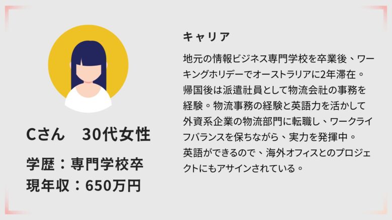 Cさん:専門学校卒→派遣社員を経て外資系企業の物流部門