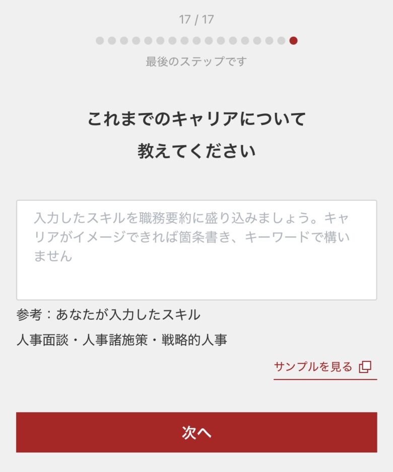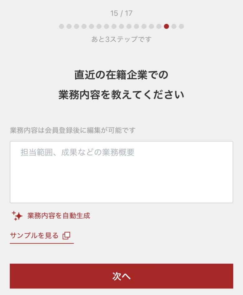こちらも後で編集できるので基本的な情報でOK。箇条書きやキーワードのみの入力も可です。